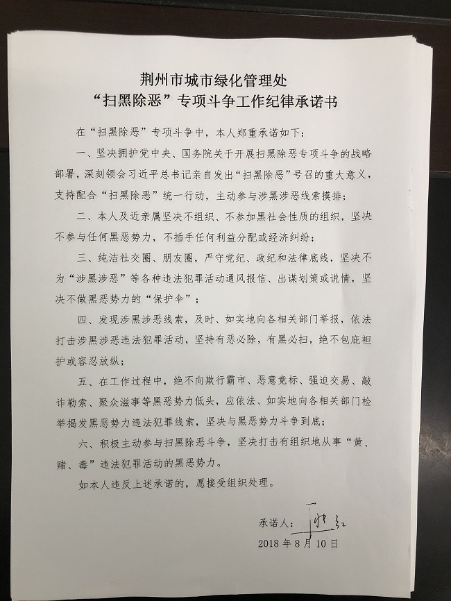 之后,黨員同志們圍繞“掃黑除惡、勇當(dāng)先鋒”主題開(kāi)展了討論,進(jìn)一步統(tǒng)一了思想認(rèn)識(shí),紀(jì)律意識(shí)、規(guī)矩意識(shí)、責(zé)任意識(shí)得到強(qiáng)化,為堅(jiān)決打贏掃黑除惡專(zhuān)項(xiàng)斗爭(zhēng)攻堅(jiān)戰(zhàn)提供了思想和紀(jì)律保障。 最后,綠化處全體黨員同志簽訂了《“掃黑除惡”專(zhuān)項(xiàng)斗爭(zhēng)工作紀(jì)律承諾書(shū)》?!冻兄Z書(shū)》從6個(gè)方面規(guī)定了掃黑除惡工作中需要遵守的紀(jì)律,要求全體干部職工自覺(jué)投身掃黑除惡專(zhuān)項(xiàng)斗爭(zhēng),積極配合做好掃黑除惡專(zhuān)項(xiàng)斗爭(zhēng),以身作則,帶頭遠(yuǎn)離黑惡勢(shì)力,并對(duì)發(fā)現(xiàn)和掌握的涉黑涉惡違法犯罪及苗頭,及時(shí)向單位舉報(bào)。同志們紛紛表示,要切實(shí)履行承諾,筑牢防線、不踩紅線、守住底線,本著對(duì)組織、對(duì)家庭負(fù)責(zé)的態(tài)度,嚴(yán)格要求自己,勇于擔(dān)當(dāng)、敢于碰硬,自覺(jué)同黑惡勢(shì)力做斗爭(zhēng),發(fā)揮先鋒模范作用,推動(dòng)綠化處“掃黑除惡、勇當(dāng)先鋒”專(zhuān)項(xiàng)斗爭(zhēng)工作向縱深發(fā)展。